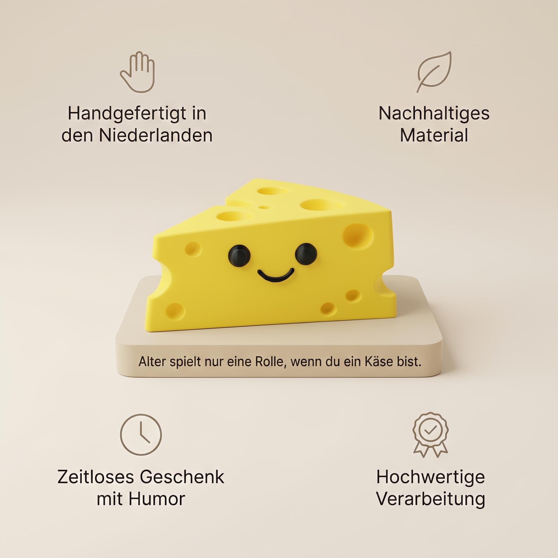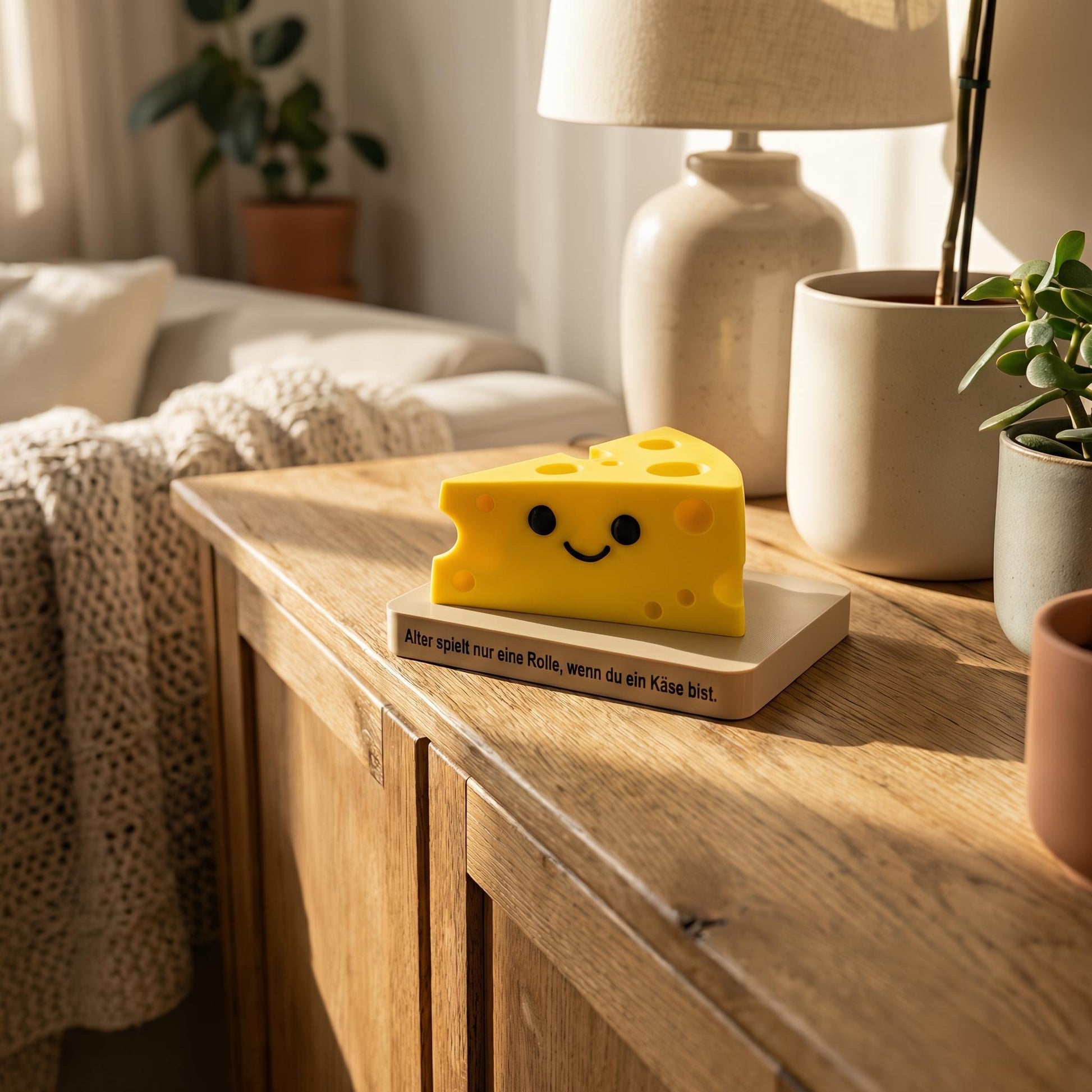Op zoek naar een verjaardagscadeau dat wél origineel voelt? Dit vrolijke kaasje op een stijlvolle base is een superleuk decoratiestuk voor bureau, kast, nachtkastje of woonkamer. Het is precies zo’n cadeau dat iemand neerzet en daarna elke dag ziet—met een glimlach én een gedachte aan jou.